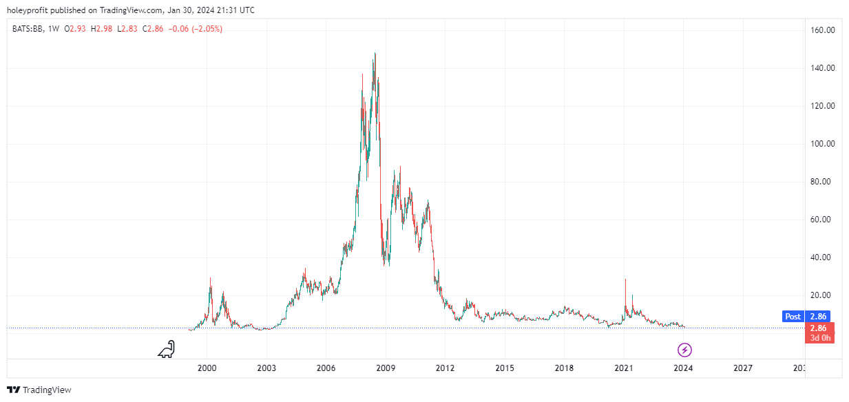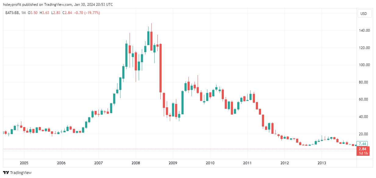 We can look at the spike out in BB in more detail on the daily chart. The main features to note are the new high. Complex bear trap. Strong final false breakout.