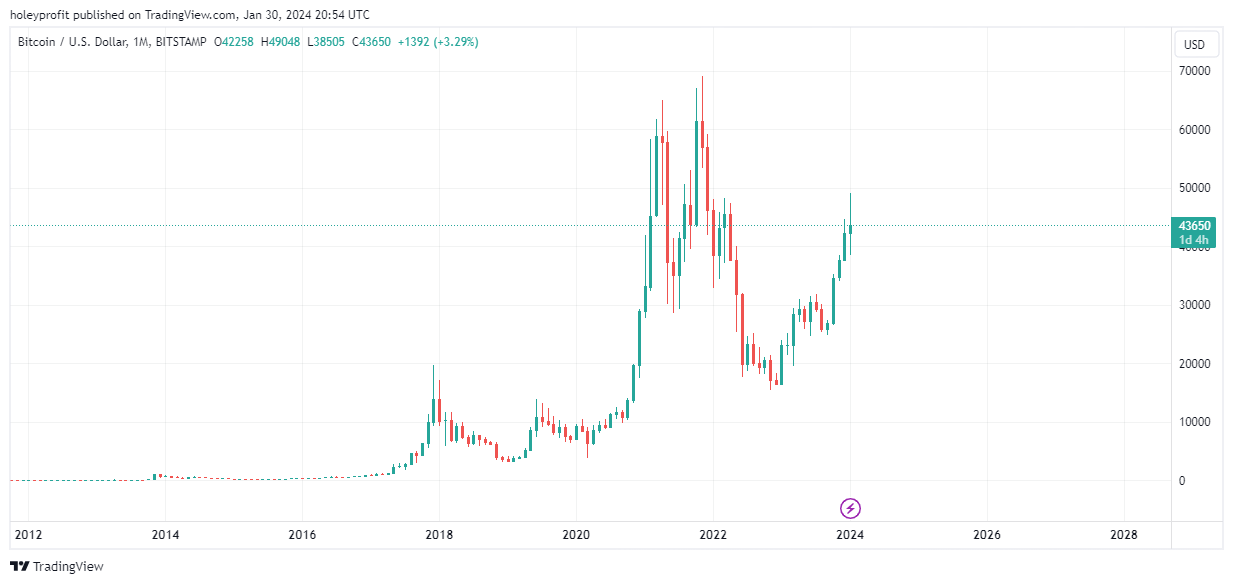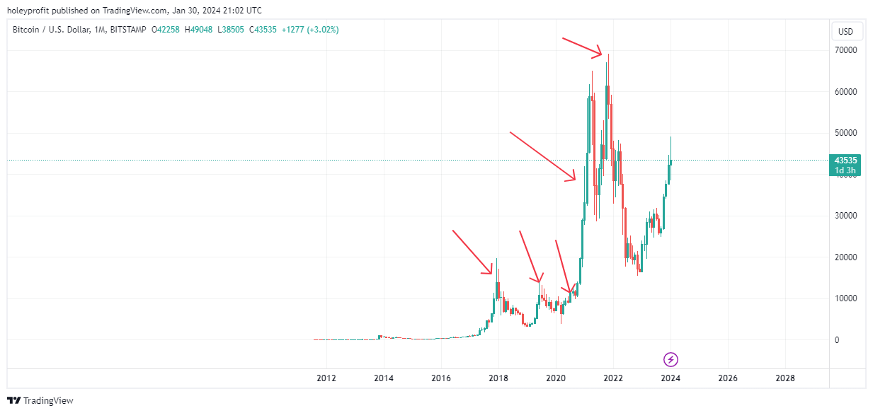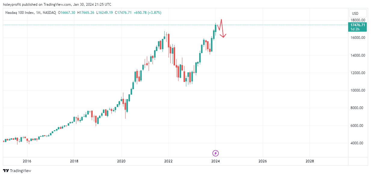 We have the big green candle with a tiny little wick in top. Telling us the month was strong but ended with some weakness. In the next month we have the spike high and the next month closes with a big bear candle.