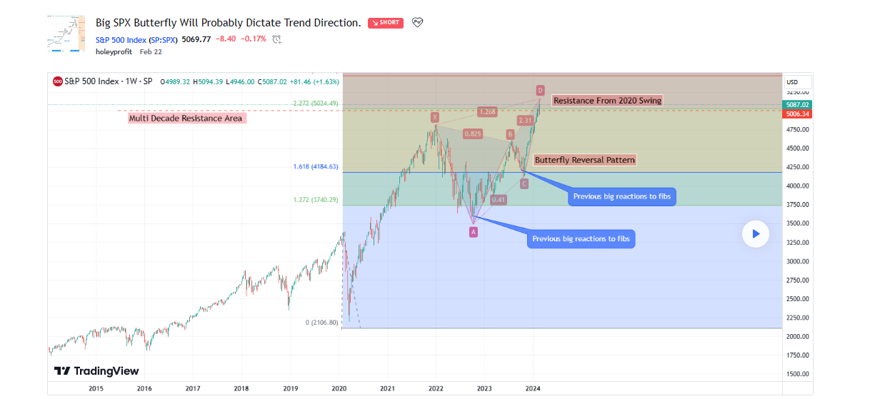 The failure of the harmonic would be a strong bull indicator. A harmonic signal forming usually tells us we’re going to see something crash like (Relative to recent action) or an important breakout telling us we’re early in what is likely to be a bigger breakout.