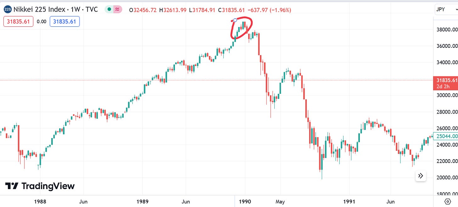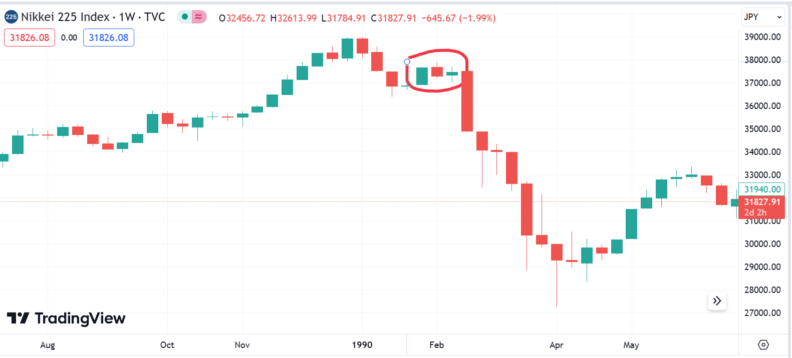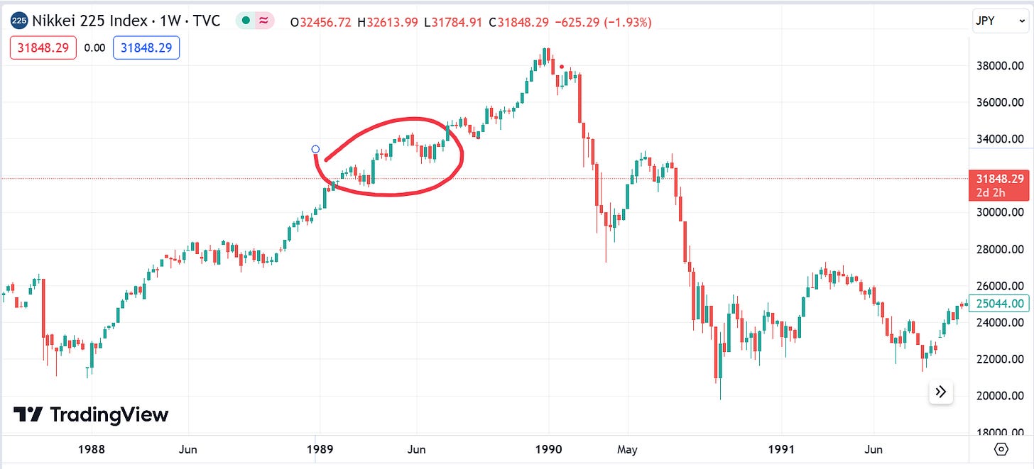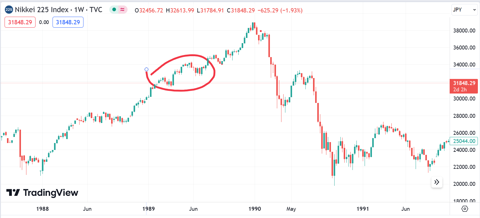 In this post I’ll show a very simple example of this in the Nikkei. Let’s say we were Nikkei bears heading into the last year of the rally.
