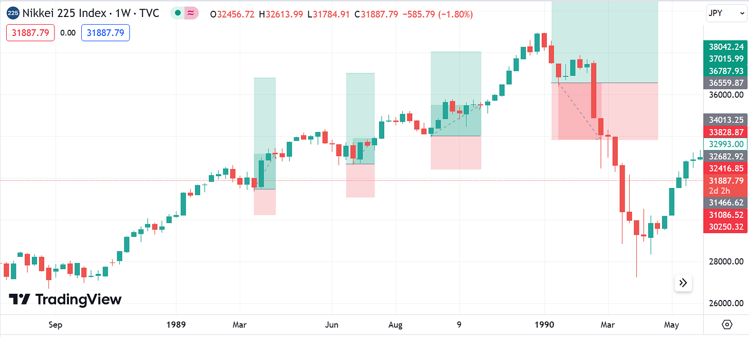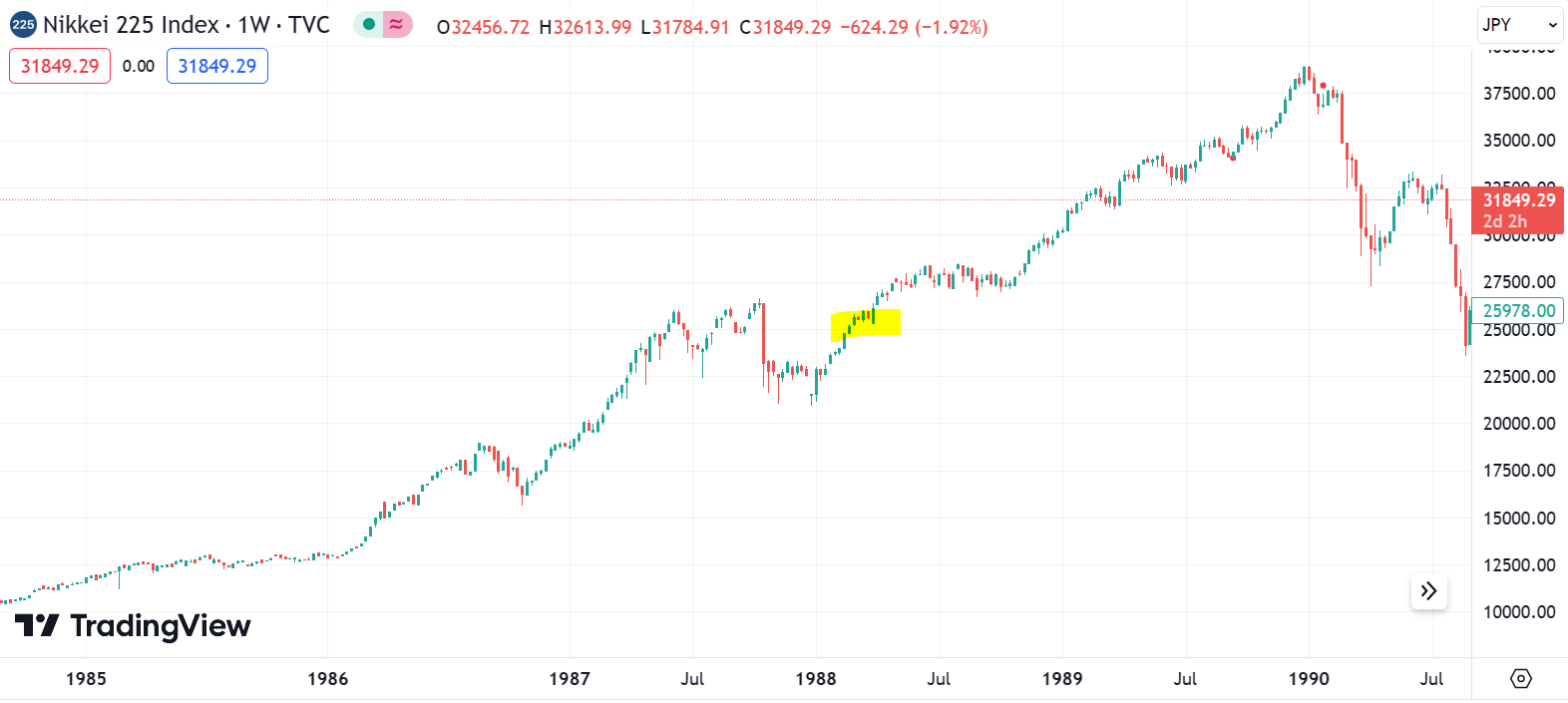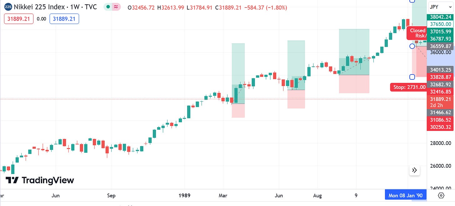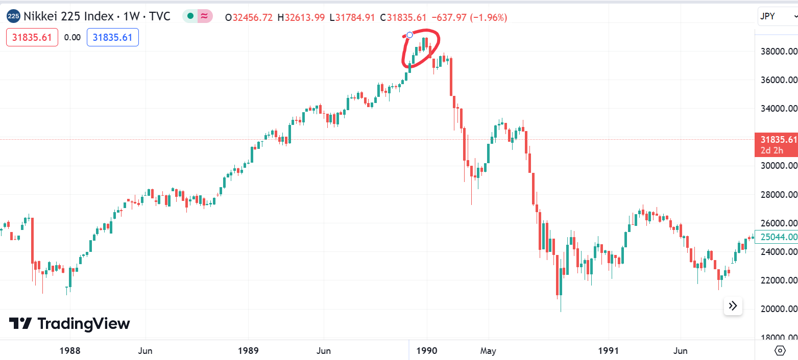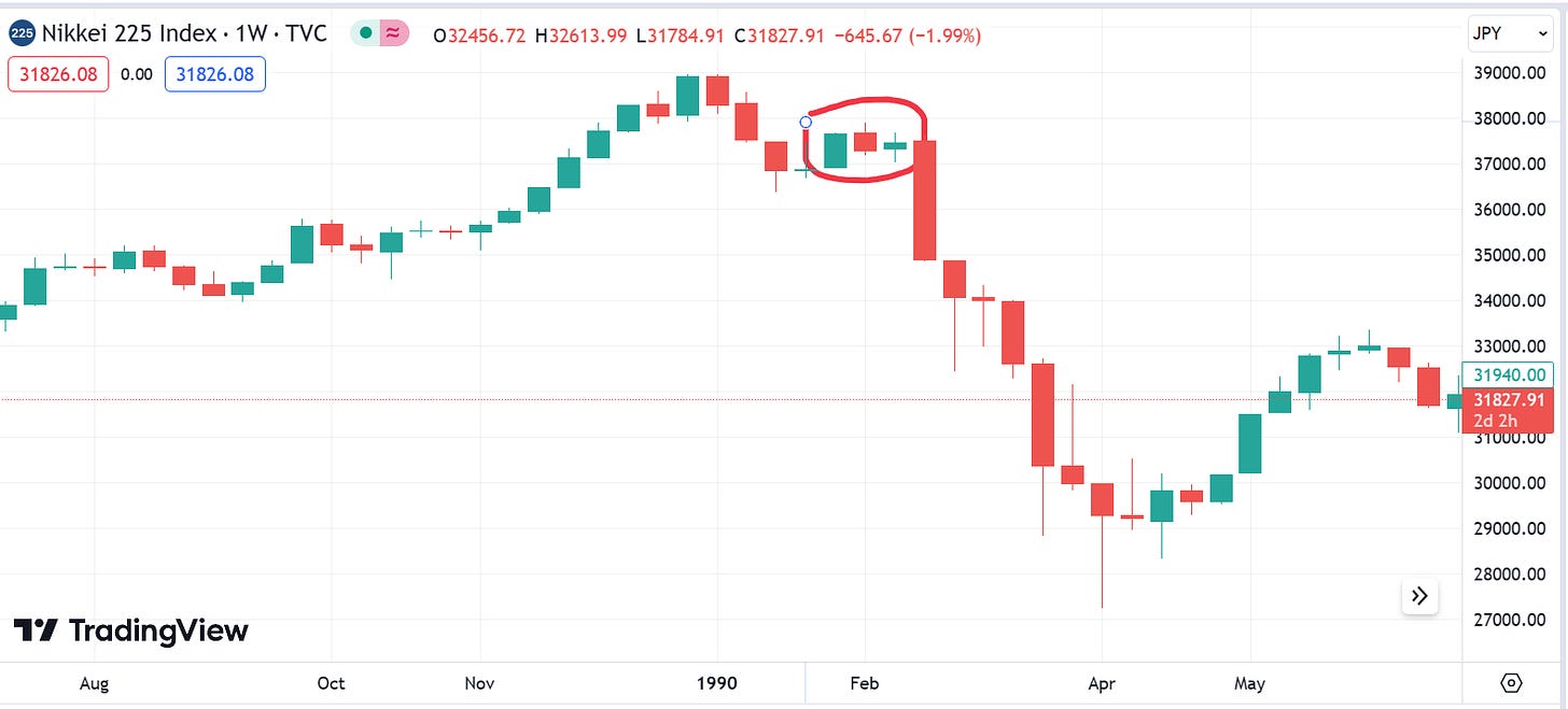 In this post I’ll show a very simple example of this in the Nikkei. Let’s say we were Nikkei bears heading into the last year of the rally.